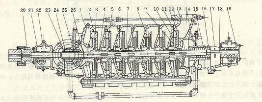 1一進水段,2中段 3-升輪;4軸, 5- 導輪;6-承磨環(huán);7-葉輪擋套;8-導葉套;9-平衡盤;10-平衡套;11-平衡環(huán);12-出水段導輪;13-出水段;14-尾蓋;15-軸套乙;16-軸套螺母;17一擋水圉;18-平衡盤指針;19-軸承乙部件;20聯(lián)軸器;2l軸承甲部件;22-油環(huán);23-軸套甲,24~填料壓蓋;25-水封環(huán);26-拉緊螺栓