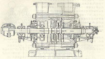 在壓力較高時,通常采用分段式多級離心泵。這種泵是一種垂直剖分多級泵,它有一個前段、一個尾段和若干個中段組成,用四個長桿螺栓連接為一個整體。安裝在泵軸上的葉輪的個數(shù)就代表離心泵的級數(shù),中段的每個葉輪配一個導輪,導輪的作用基本上同蝸殼相同,主要是將動能轉化為靜壓能。葉輪一般為單吸的,吸人口都朝向一個方向。為了平衡軸向力,在末段后面裝有平衡盤,并用平衡管和前段進口相連通。其轉子在工作過程中可以沿軸向左右竄動,靠平衡盤的推力平衡葉輪組的軸向力,將轉子維持在平衡位置附近。軸的兩端用軸承支承,并置于軸承座上,軸的兩端均有軸封裝置。